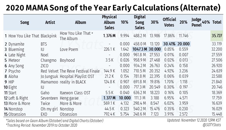 Soty Stats On Twitter Alternate 2020 Mama Soty Early Calculations November 12 12pm Kst Update How You Like That Will Take The Lead If Sales For The Album Will Be Considered 1