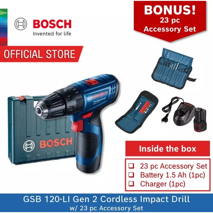 Bosch Gsb 120 Li Gen 2 Cordless Impact Drill With Battery Charger Carrying Case Bonus 23pc Accessories Kit Shopee Singapore