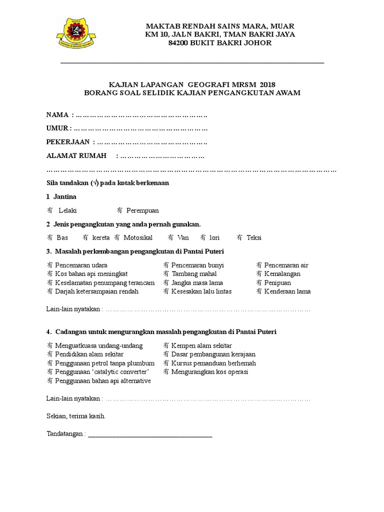 Contoh Borang Soal Selidik Sistem Pengangkutan Geografi Pt3 Contoh Jari Cute766