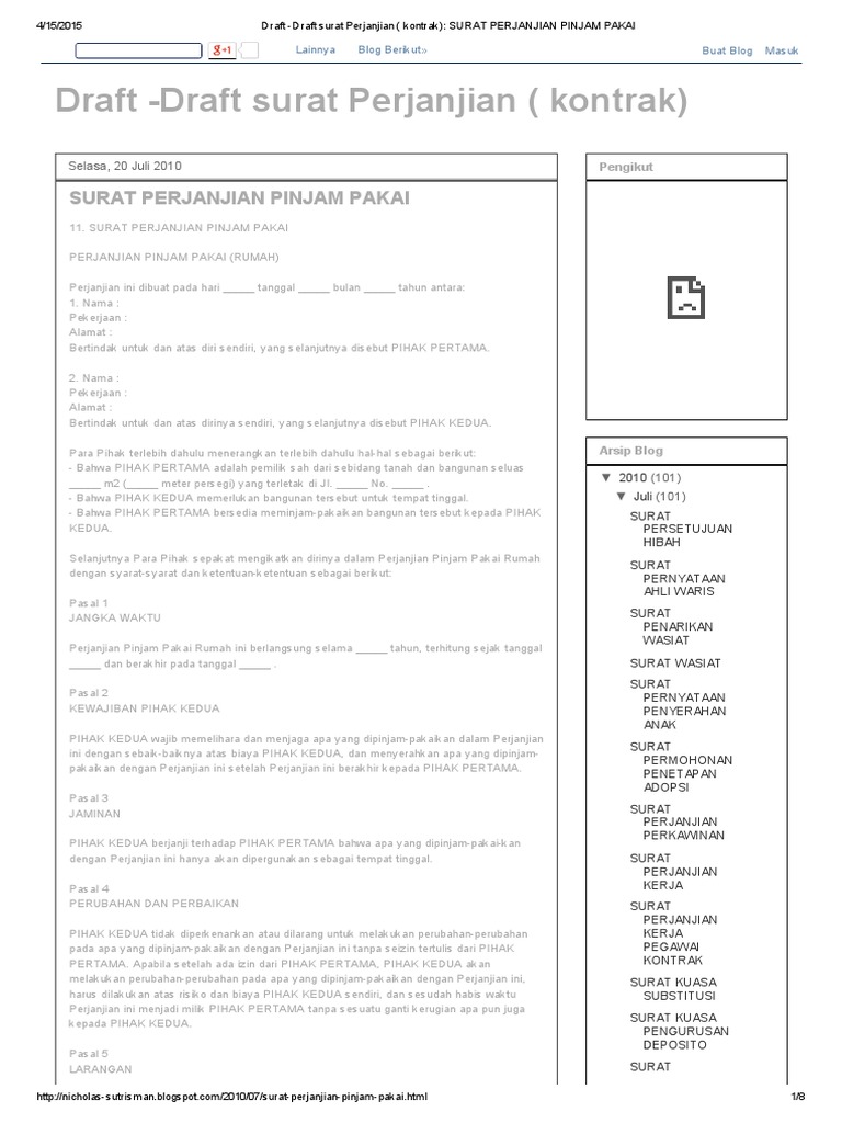 Draft Draft Surat Perjanjian Kontrak Surat Perjanjian Pinjam Pakai