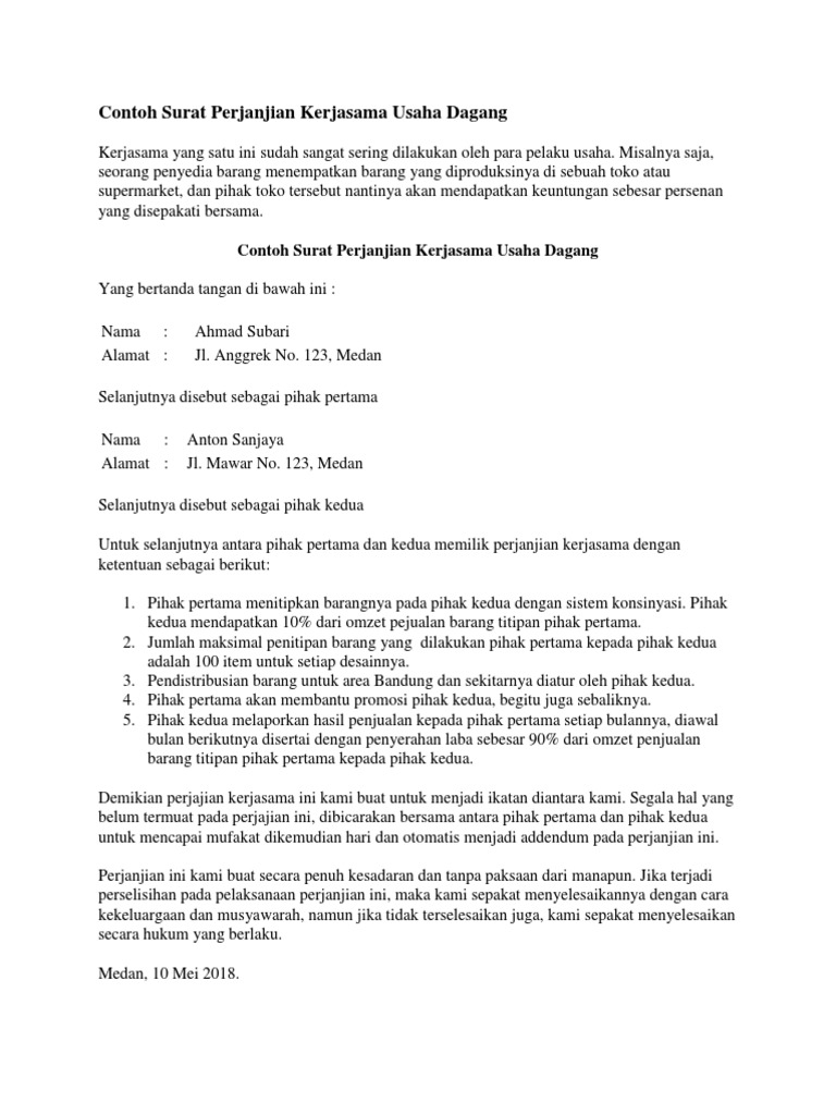 Contoh Surat Perjanjian Kerjasama Usaha Perdagangan Suratkerja Com