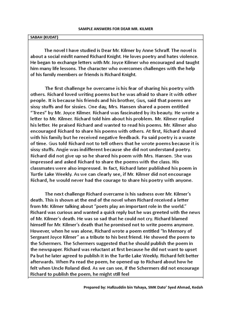 2018 Sample Answers Dmk Pdf Sample Answers For Dear Mr Kilmer Sabah Kudat The Novel I Have Studied Is Dear Mr Kilmer By Anne Schraff The Novel Is Course Hero