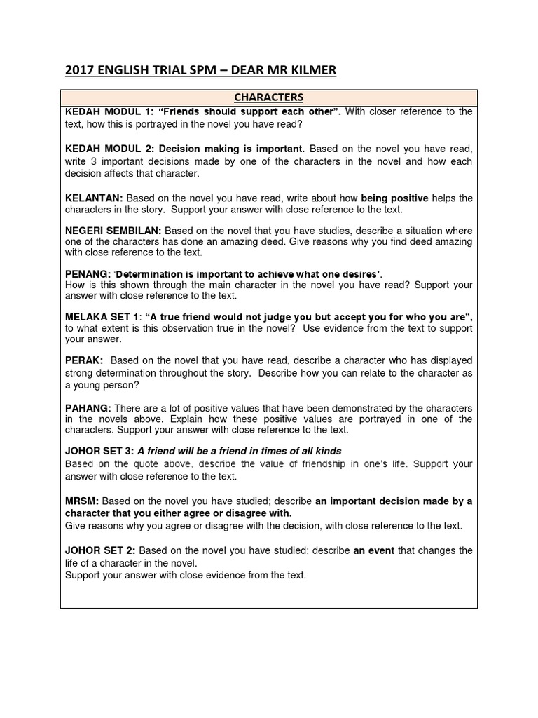 2017 English Trial Spm Dear Mr Kilmer