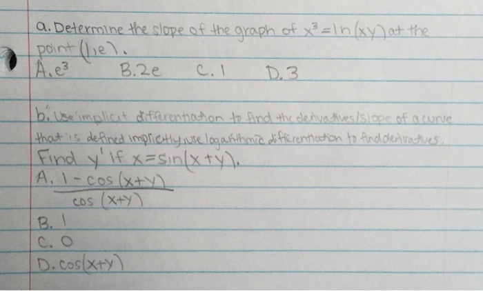 Determine The Slope Of The Graph Of X3 Ln Xy At The Point 1 E 5 Points