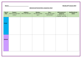 Formal And Informal Letter Comparison Sheet Teaching Resources