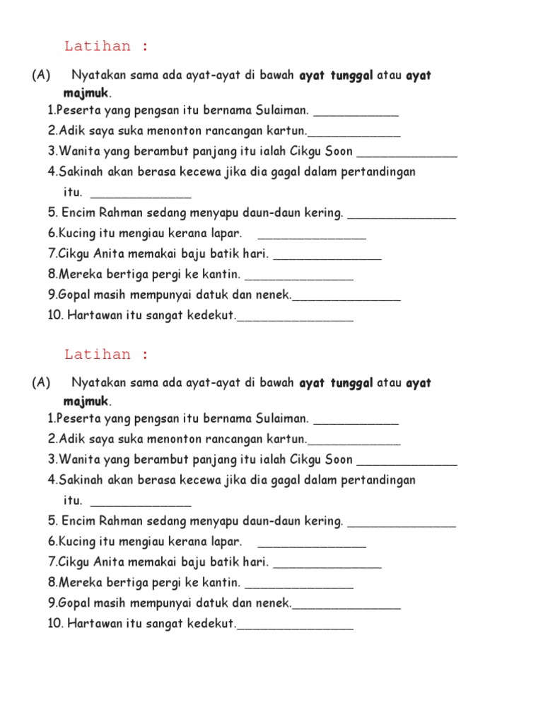 Latihan Ayat Tunggal Dan Ayat Majmuk Tahun 6