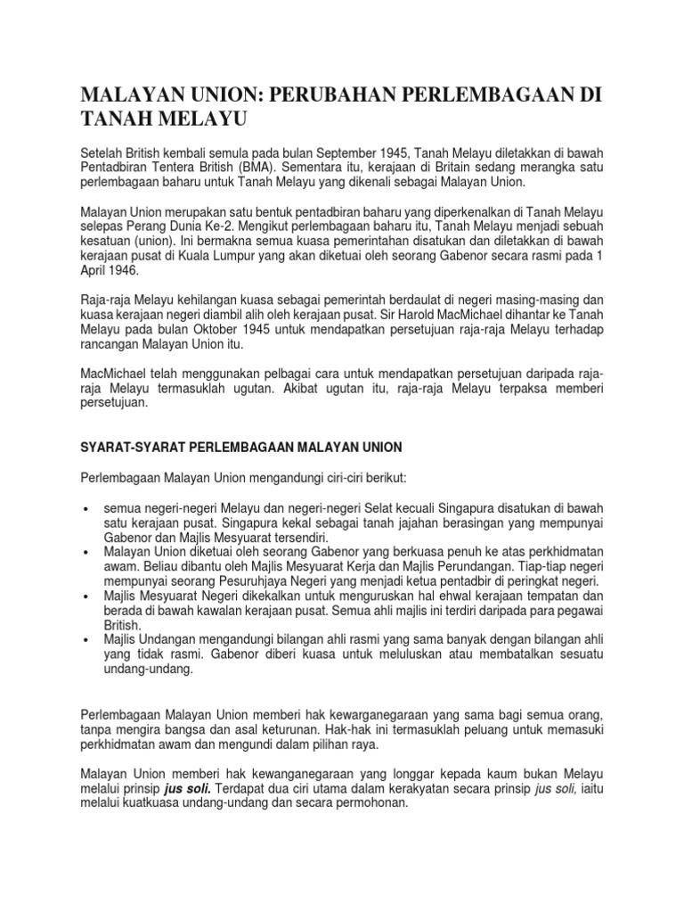 Sejarah Stpm Malayan Union Perubahan Perlembagaan Di Tanah Melayu