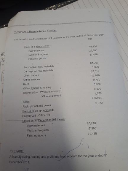 Solved Tutorial Manufacturing Account The Following Are Chegg Com
