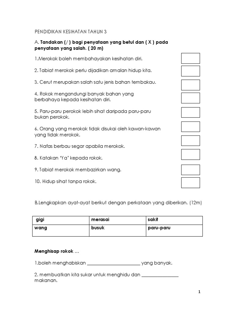 Lembaran Kerja Pendidikan Kesihatan Tahun 1