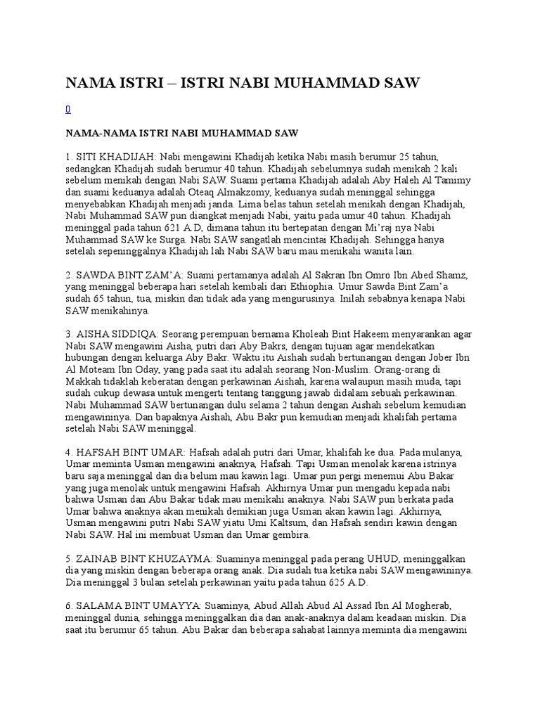 Nama Nama Istri Nabi Muhammad Saw Dan Anak Anaknya