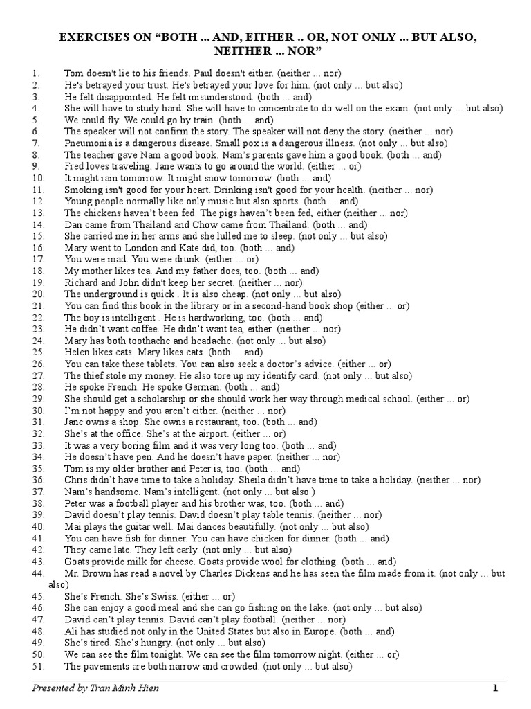 Exercises On Both And Either Or Not Only But Also Neither Nor Doc Leisure