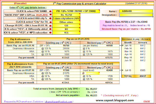 7th Pay Commission Pay And Arrears Calculator Excel Download Sa Post