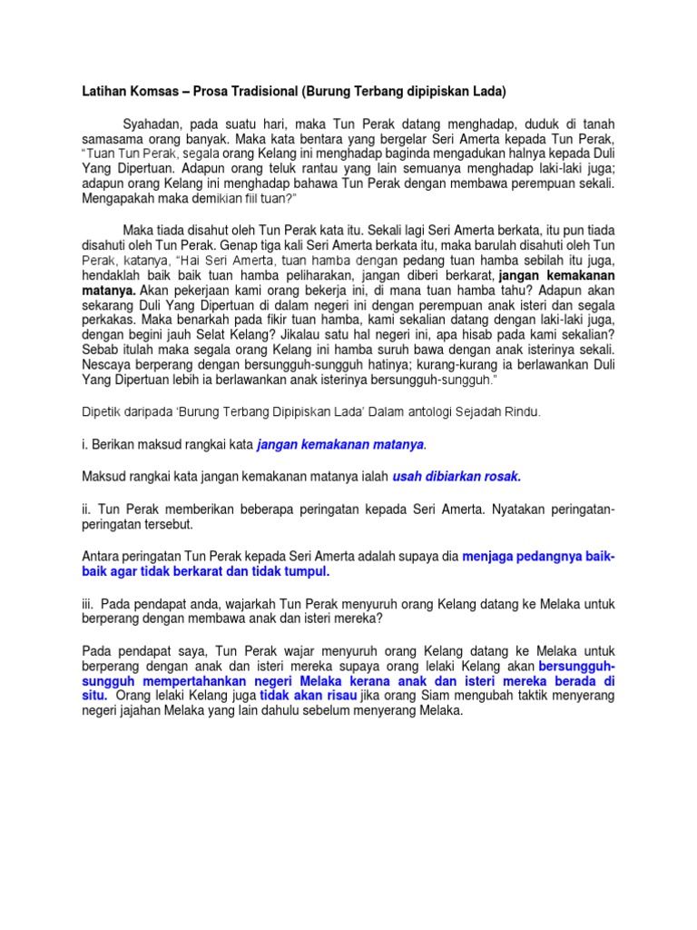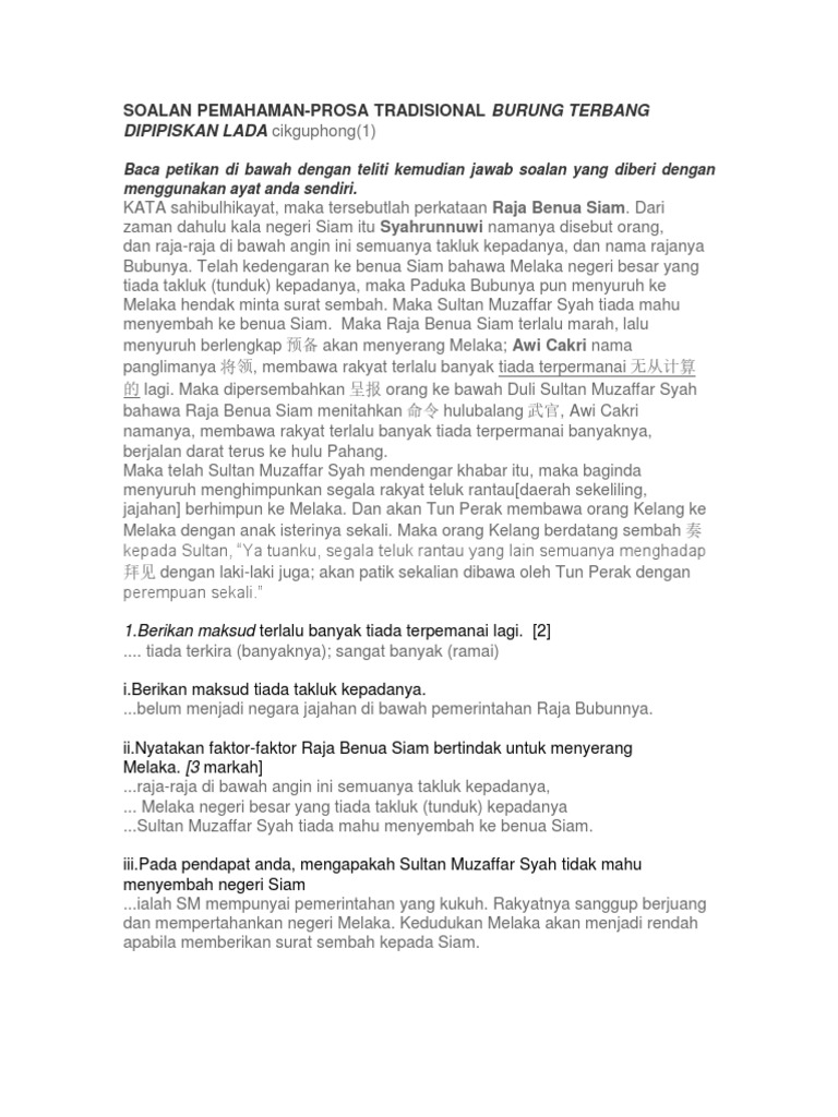 Soalan Dan Jawapan Prosa Tradisional Burung Terbang Dipipiskan Lada Selangor K