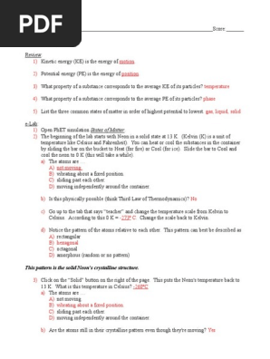 11 7 States Of Matter Phet Lab Answers Name Score States Of Matter Review 1 Kinetic Energy Ke Is The Energy Of Motion 2 Potential Energy Pe Is The Course Hero