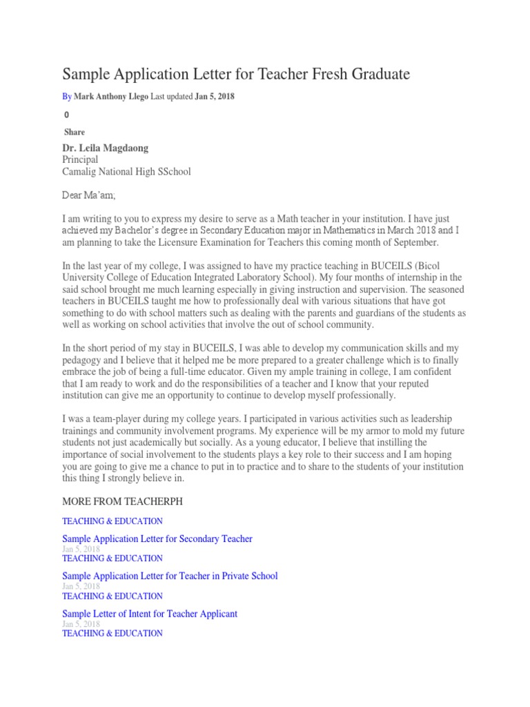 Sample Application Letter For Teacher Fresh Graduate Teachers Academic Degree