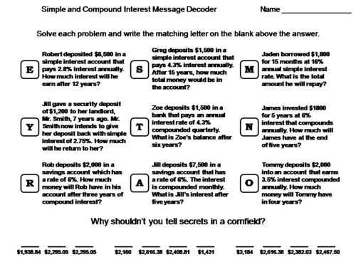Simple And Compound Interest Worksheet Math Message Decoder Teaching Resources