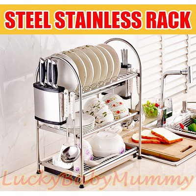 Premium Stainless Steel 3 Tier Dish Rack With Drying Drainer Tray Holder Kitchen Shelf Storage Cup Silver Lazada Singapore