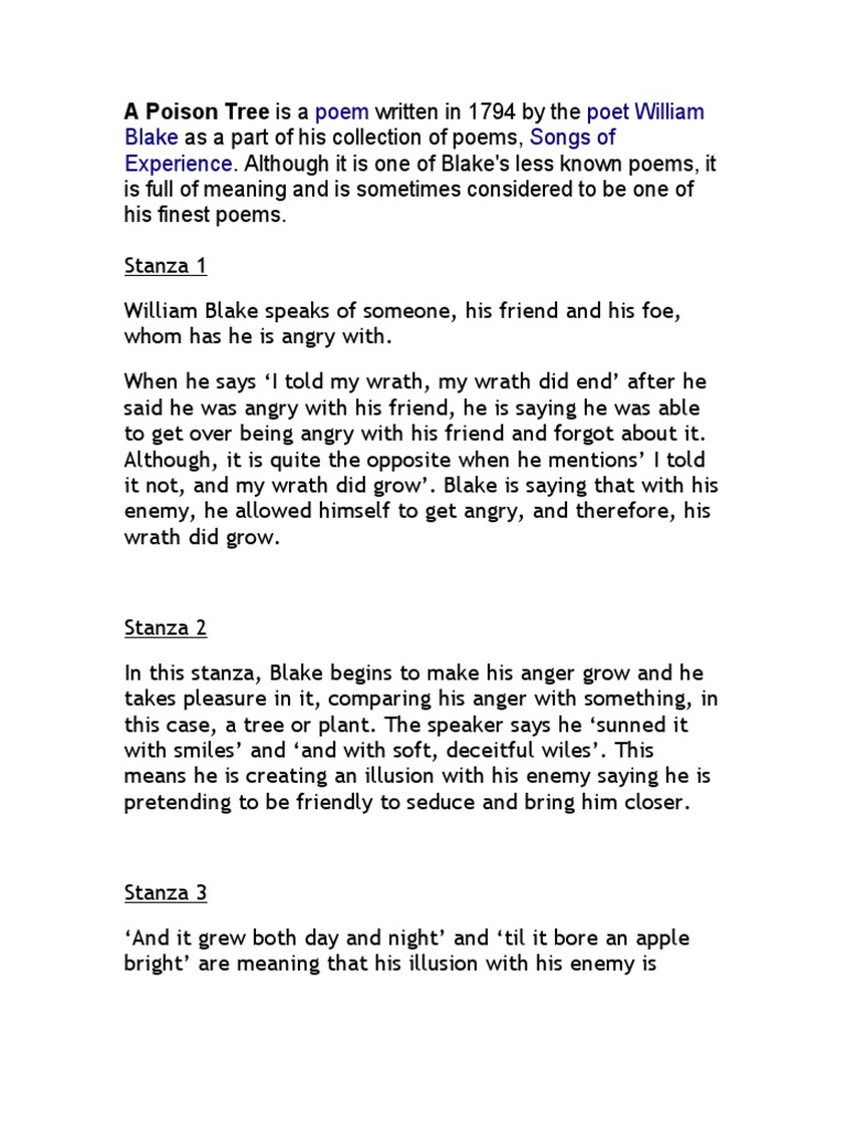 A Poison Tree Analysis William Blake Poems The Poison Tree Poison Tree William Blake Poems A Poison Tree Analysis