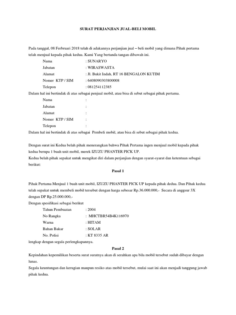 Draft Lengkap Surat Perjanjian Jual Beli Mobil Portalinvestasi Com