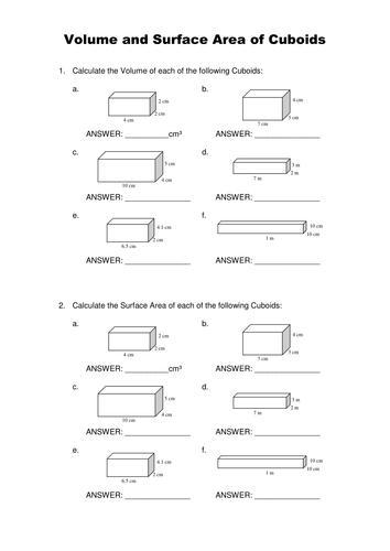 Volume And Surface Area Of Cuboids Exercise Teaching Resources