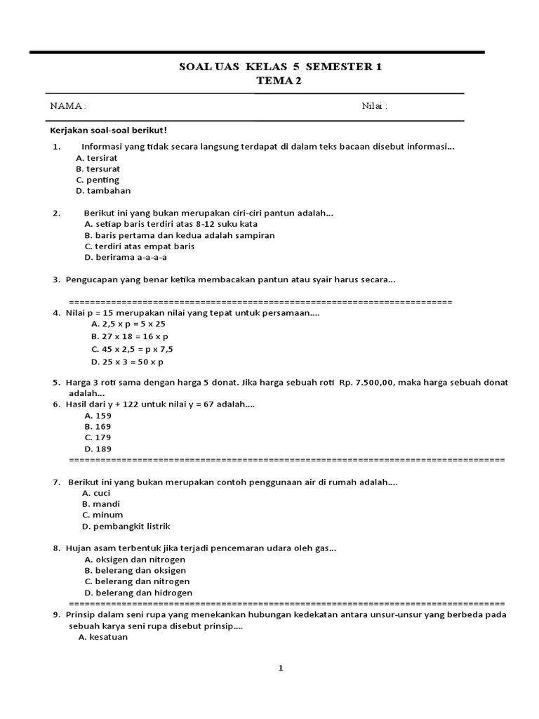 Soal Uas Kelas 5 Smtr 1 Tema 2
