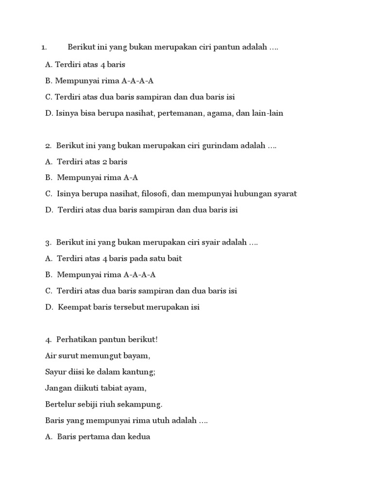 Yang Bukan Merupakan Ciri Ciri Pantun Adalah A Setiap Baris Terdiri Atas Empat Bait B Bersajak Brainly Co Id